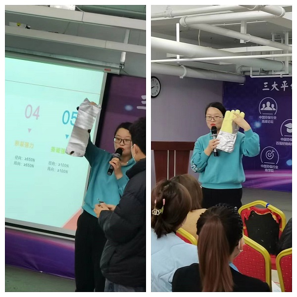 培訓(xùn)持續(xù)了40分鐘左右,盧經(jīng)理與王經(jīng)理在講臺上詳細的講解產(chǎn)品賣點,并且對產(chǎn)品材質(zhì)等進行了隔熱“試驗”,我司銷售團隊家人在臺下專心致志的傾聽,因為我們恒安人知道只有產(chǎn)品了解的清楚透徹,才能更好的服務(wù)我們的客戶、才能更好提升我們恒安的整體力量,才能更好的保障每位勞動者的生命安全。