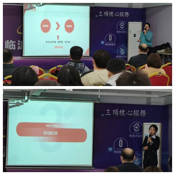 2023年3月24日早會,振東勞衛(wèi)士廠家盧經(jīng)理和王經(jīng)理來我司進行隔熱特種防護產(chǎn)品知識講解,所有銷售家人參加了此次培訓(xùn)會議。振東勞衛(wèi)士廠家與我司進行了長達6年左右的合作,分別從耐高低溫系列防護服、防護手套、防化服、電弧服 、絕緣服和消防服等多個方面進行了詳細講解 。